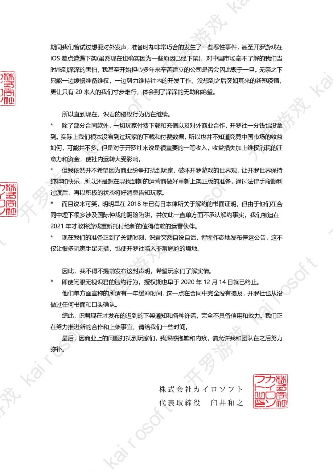 而识君这一次的行为正是标准的盗版(在法律上构成),而识君凭借跨国维权难,和国内相对闭塞的信息环境,在合同上代理期限后任然欺骗玩家和开罗游戏公司,继续全盘代理开罗游戏(其中所有盈利都被识君私吞)。这方面的详情可以参考下面的照片。