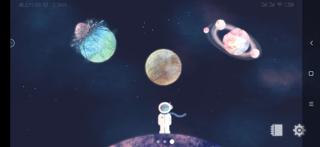 每通过一个星球的关卡后,在左下角的小书本图标中都会解锁一篇小日记,描述的是身为宇航员的我,因为工作的关系没能好好的陪伴我的妻子和女儿,但女儿在我的影响下渐渐喜欢上了航天,长大后为了航天工程师,并且偷偷转职成航天员,在一次飞行中失踪,而我怀着对女儿的亏欠,偷走了一艘飞船,踏上了寻找女儿的路。说实话就我个人而言,并没有被这条剧情线感动到,甚至觉得有些多余,因为就游戏的体验而言,和这条剧情线的割裂太严重了,日记的内容和星球中的关卡基本没有什么联系,也就难以让人产生代入感。