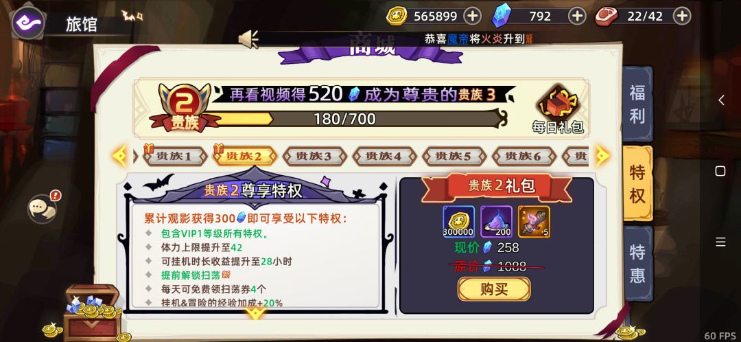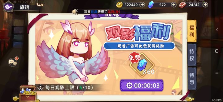 如果能接受看广告的话(一次30S左右)这个设定还是挺爽的,看一次给60钻,VIP等级只和看广告的数量相关,看的越多VIP等级越高,能够得的福利也越多。这游戏如果直接用钻买抽奖券的话是100钻一张,相当于一天白嫖五抽。