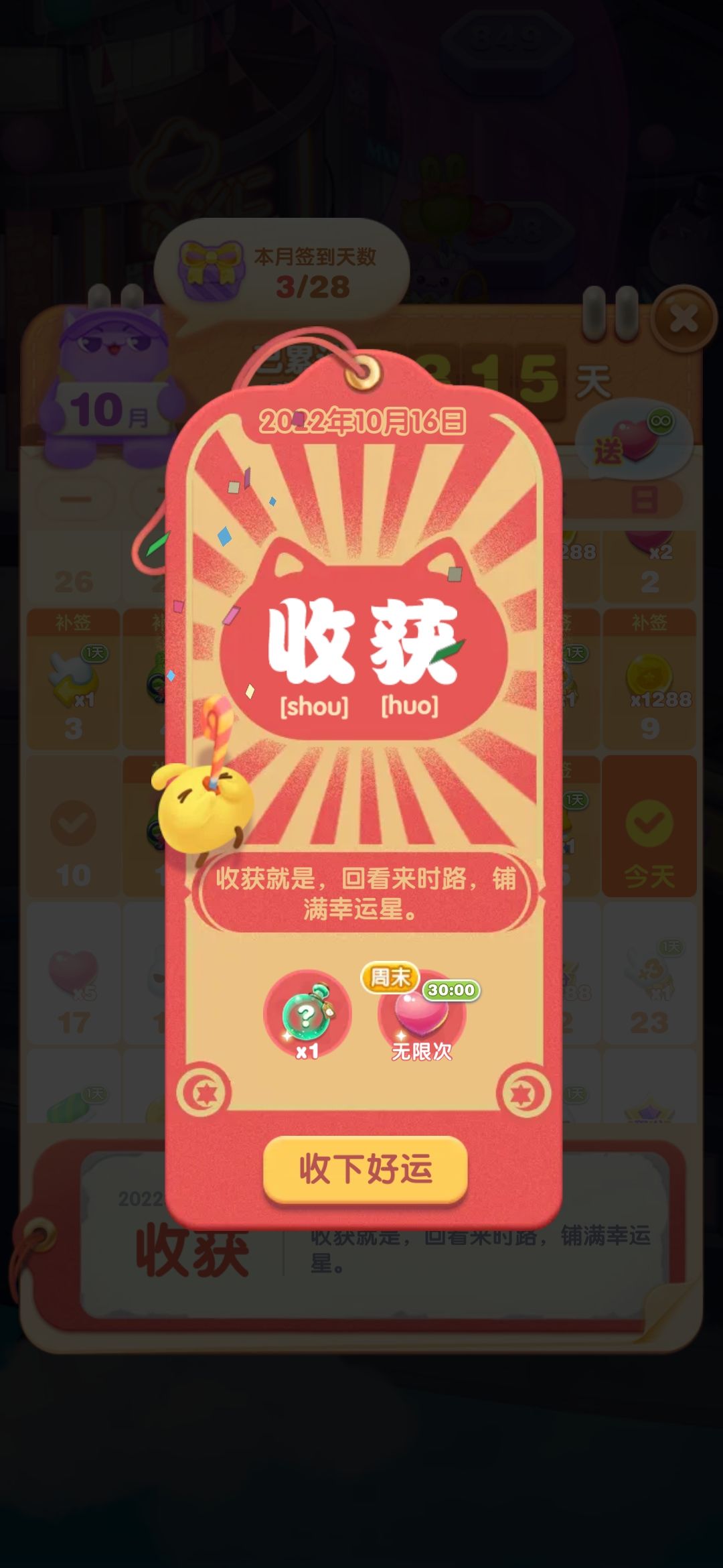 这个游戏挺不错的,等人等车的时候,无聊的时候玩一玩,消磨消磨时间,挺好的。虽然不是天天玩,但是是玩得最久的游戏了,也是手机里唯一一直没删过的游戏。已经玩到843关了。玩法简单易上手,画面音乐又可爱。挺喜欢那个签到签的,每次都不同,都满满正能量。