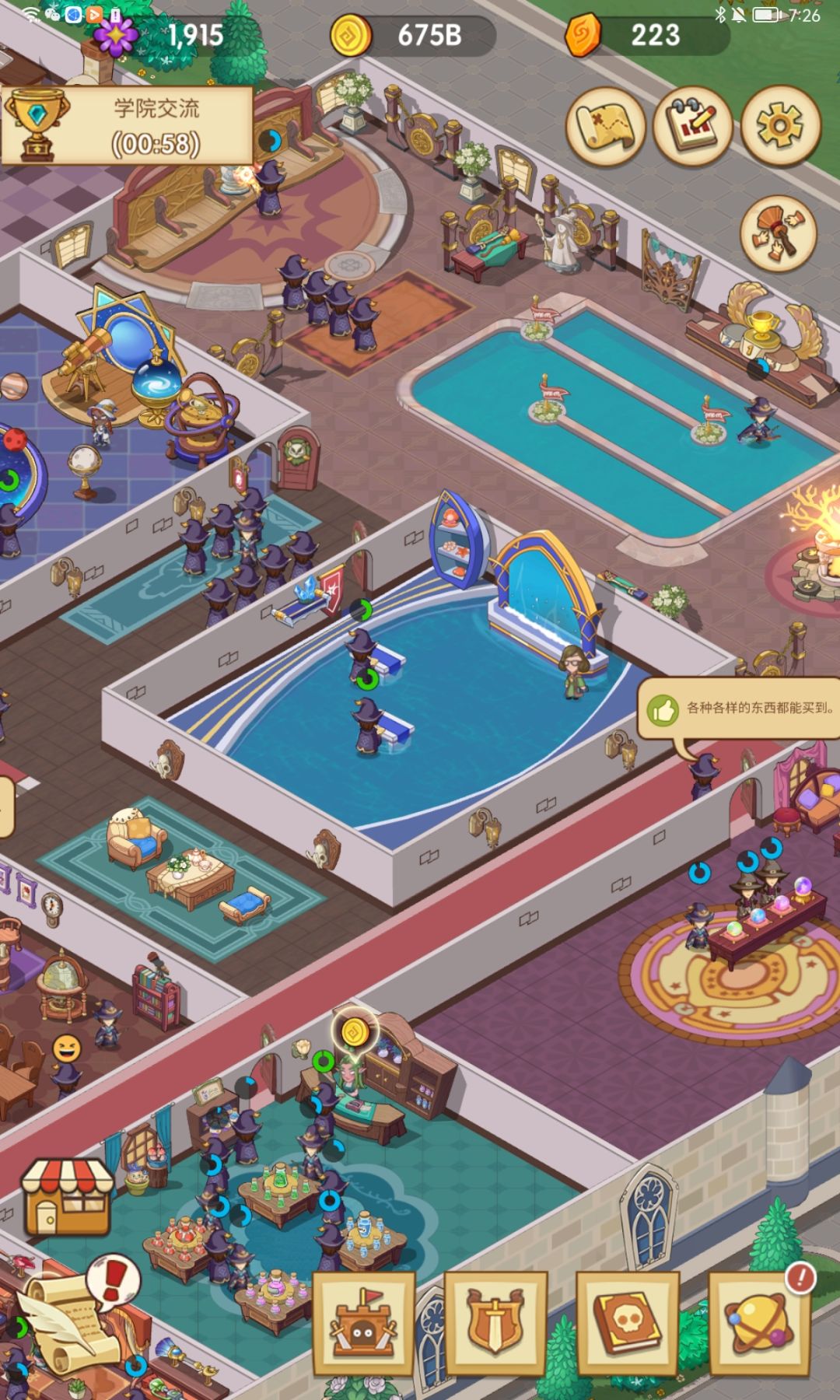 看到评论有玩家提到后面解锁场景需要几百万金币的,费时间的,我想说的是到后面你商店的收入也是十几万/分钟来算,许愿屋也是几十万/次抽取金币,你的收益和付出是成正比的,只要前期把神秘事务司里收益相关的功能点满就好了(学院收入和报名费用)
