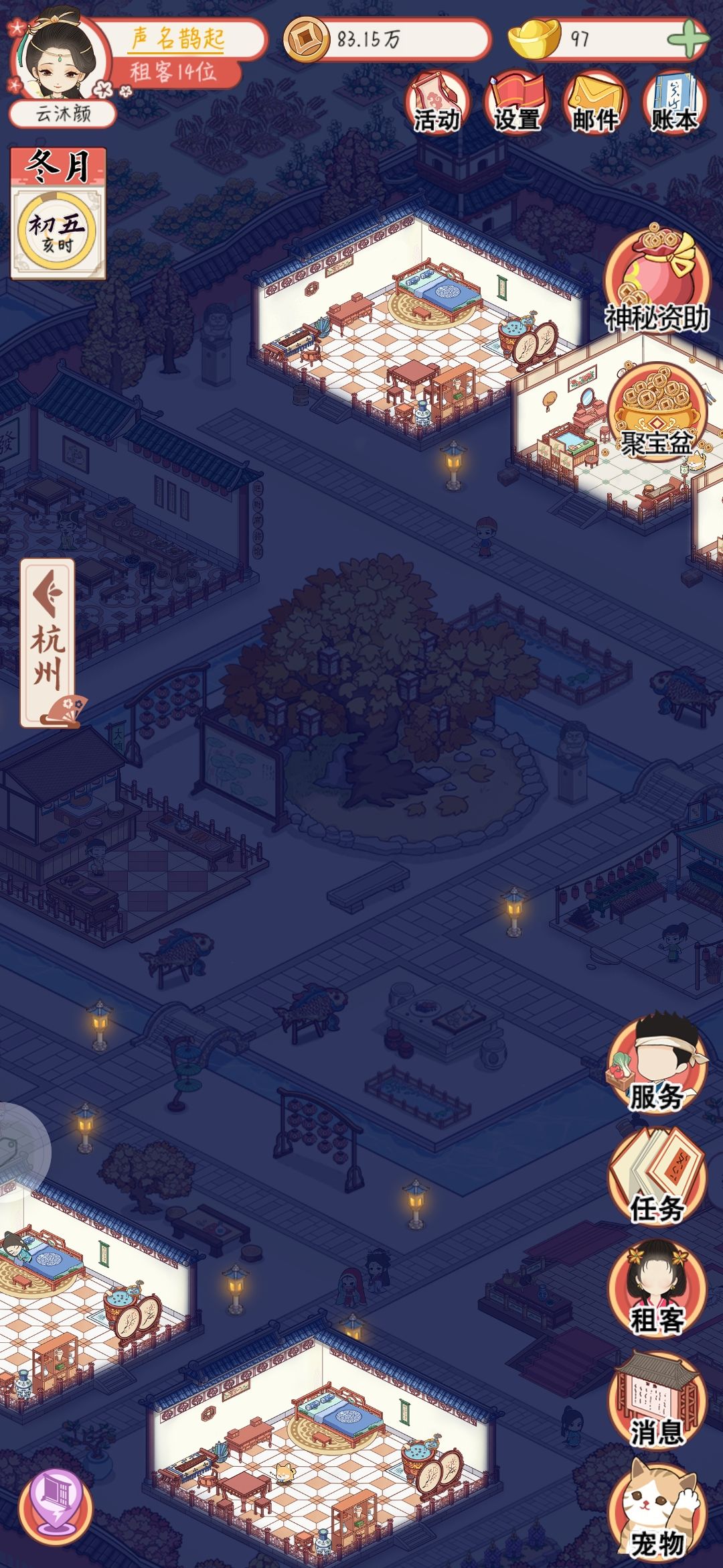 ①客户有自己的属性,可以用元宝刷新客户属性,选择租金高的客户入住。每个客户有不等的入住时长,房间等级越高,客户选择续租的可能性越大。