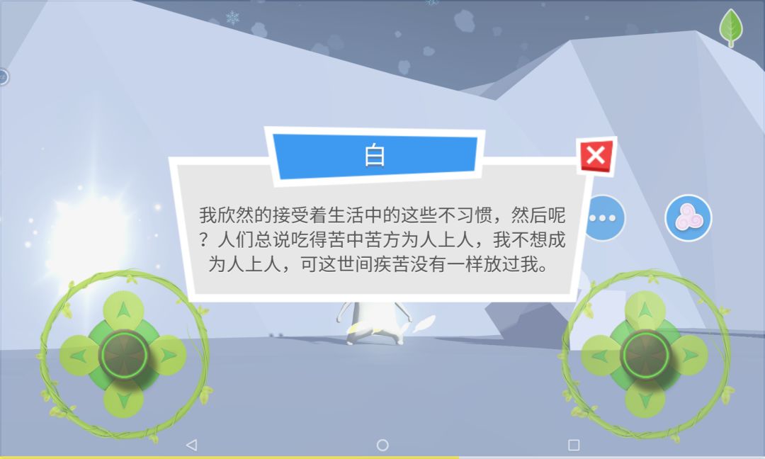 画面音乐 听起来很舒服,可玩性不高但如果想要放松心情的话,可以玩一下这个游戏音乐真的很好听,觉得最好听的也就是雪地了,有漫天飞舞的雪花,每个NPC说的话都非常触感人心建议玩一下 不过雪地的最后一个时光我一直找不到,就干脆放在那里边听音乐边写作业😂😂还有一个青竹的我没有截出来---梦想不会逃跑,逃跑的只有人类