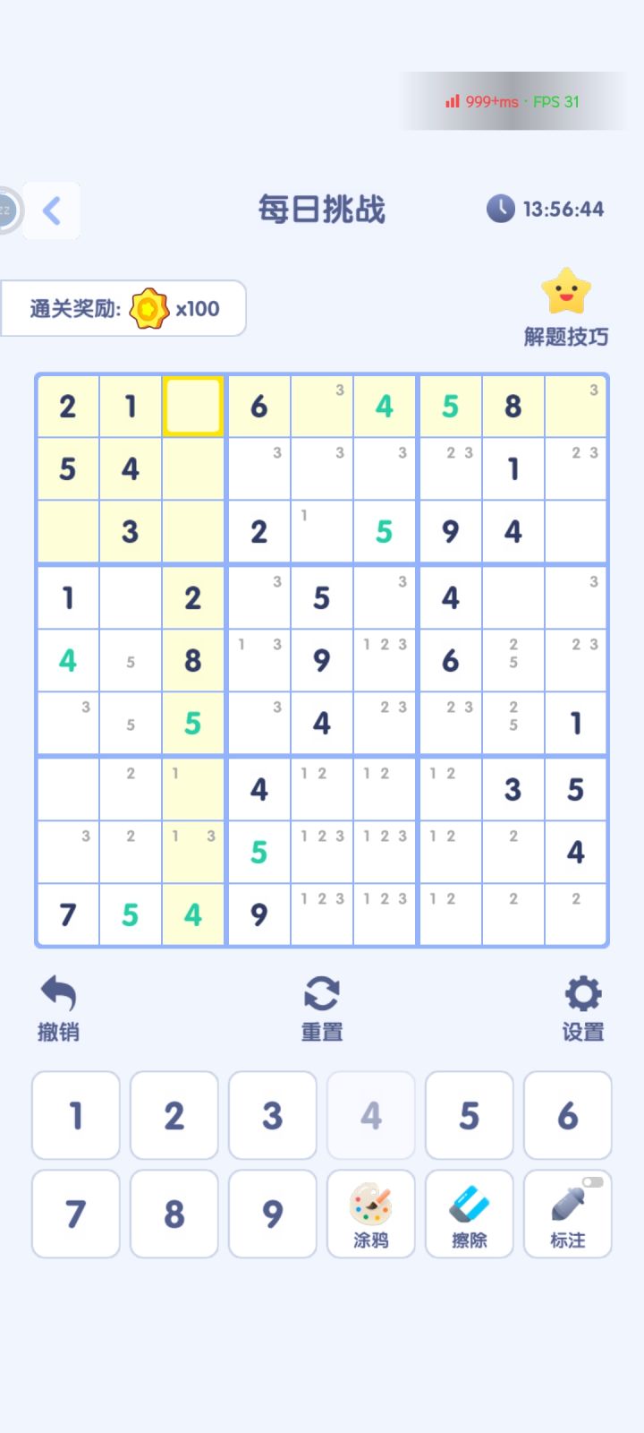 口算三年级乘法的那个不知道是不是有什么算的窍门在里面,我没有口算窍门直接嗯算说实话算着有点费劲,没有一次是完整60秒通关的。数独的标记机制有点不完善。举个例子,我在一个空格里标记了1234四个数,那我在那个空格所在的九宫格或横竖排里已经填了12两个数字,那么那个空格里标记的数字能否相应的去掉已经填了的12,留下没填的34呢(如图第四个九宫格,我已经填了5,但是我标记的5却没有去掉)这些就是我发现的一些不太人性化(?)的地方,建议官方可以在这两个方面改进一下。