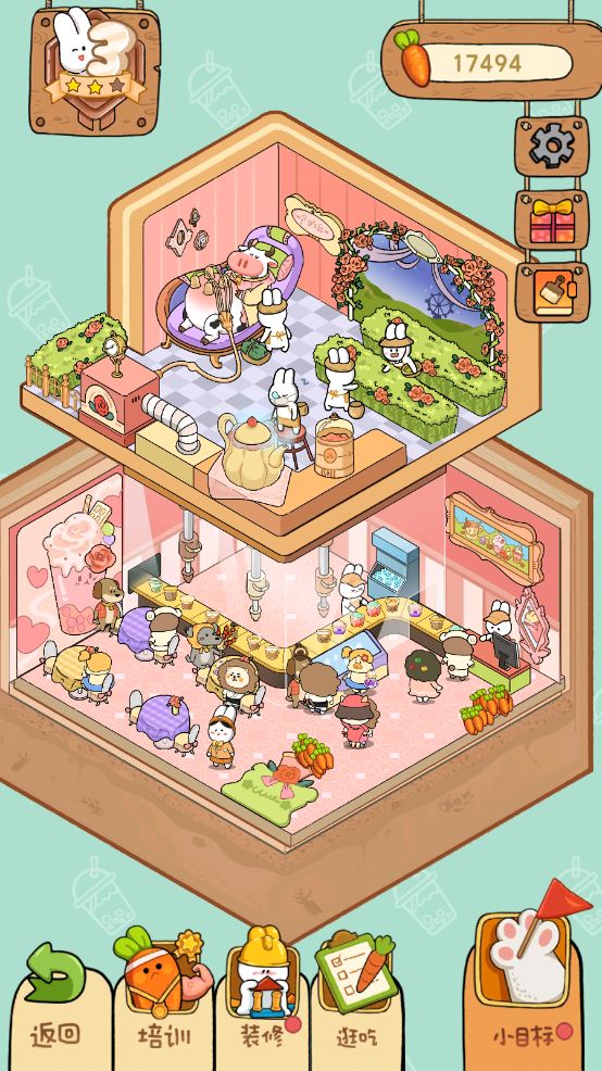 2、美术画风方面,画风可爱治愈,男女皆宜,女性用户受众可能更多,每个装修主题装扮后会有明显变化,这点很好,奶茶店二楼养牛让我很惊喜