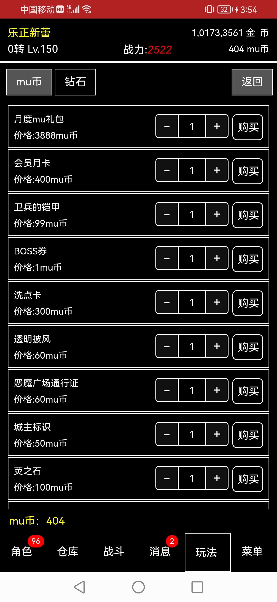 氪金度💰:说到氪金,目前我根本没有找到充值窗口,没有什么那个传奇的微信小游戏那种充值礼包怼脸,首充礼包一直冒,各种充值活动的情况,游戏内交易的东西是MU币比较多,获取难度还算低,获取难度应该是元宝>钻石>mu>金币,mu币用于拍卖行玩家之间的装备交易.物品交易。