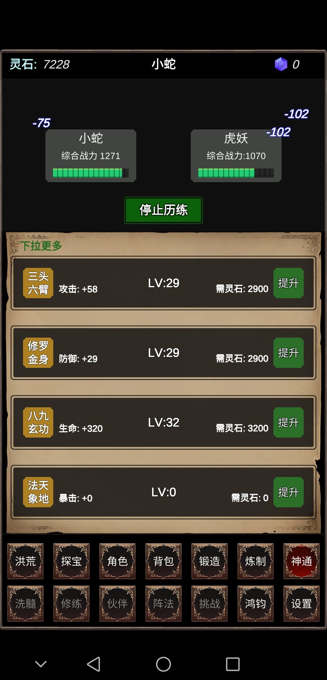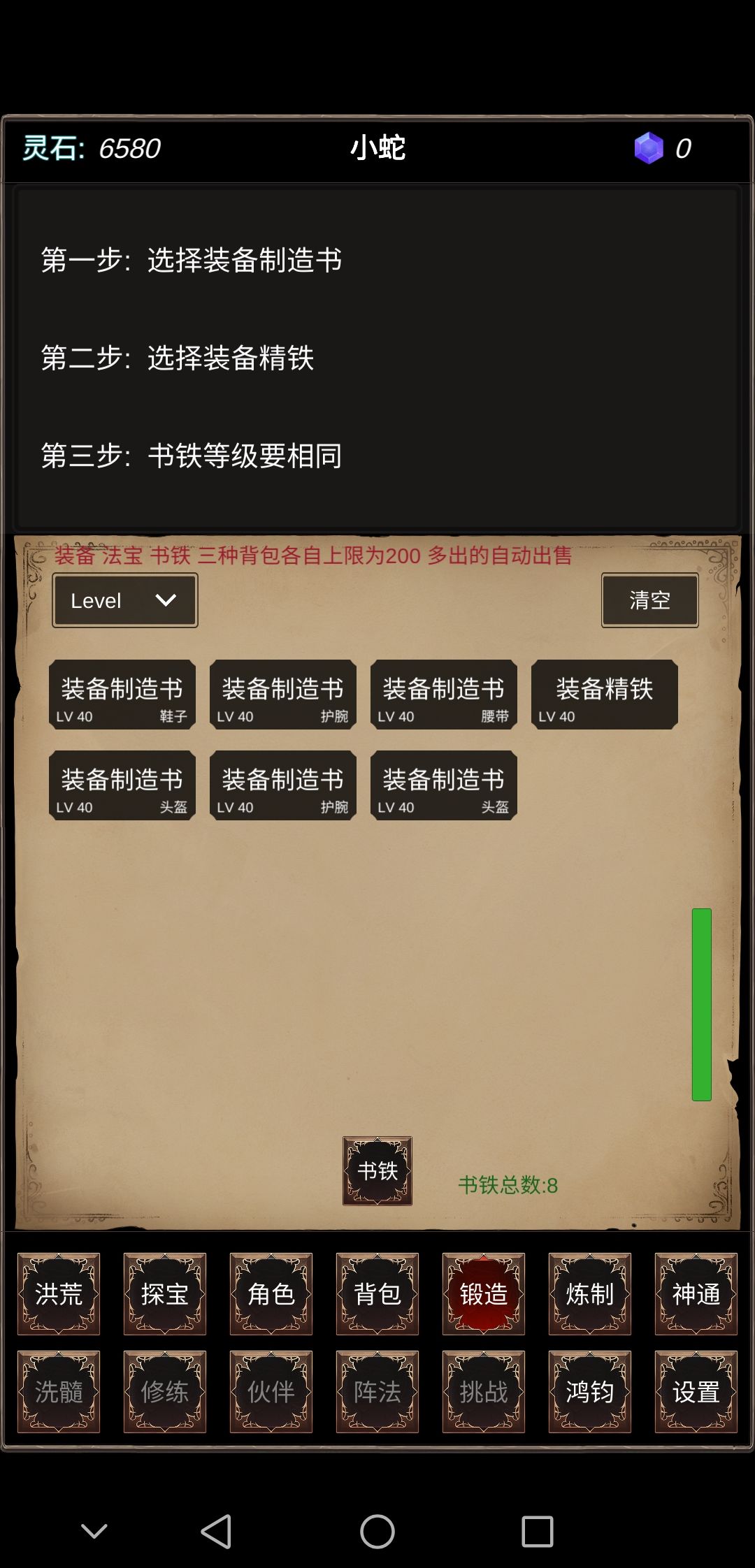 这个游戏很有意思,可以炼制法宝,锻造装备,升级神通。后期还开放阵法,排行榜,值得你选择。每天广告数只有五个,广告奖励是一枚宝石。不同于其他游戏,宝石可以兑换资源,想初期或者后期兑换都可以