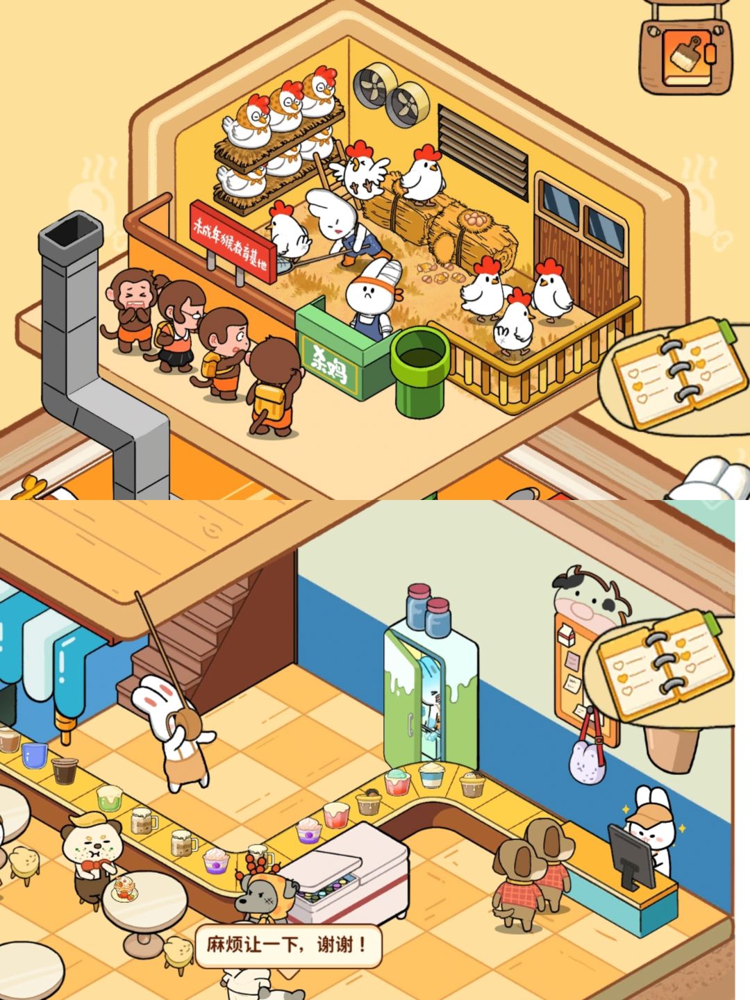然后是奶茶店,牛牛牧场主题装修里负责加冰的员工居然是躲在冰箱里的;炸鸡店的喔喔鸡主题生产线居然就是有俩员工在上面杀鸡儆猴😂😂😂真是太有意思了!这也是我最喜欢的两个店。