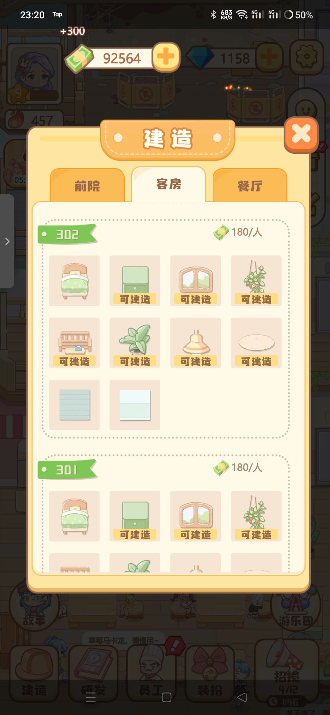 也玩过很多这一类游戏了,对于我来说的话,可玩性不算太高,画面虽然很温馨,但是要建造的家具和其他设施太贵,但是赚钱太慢,我前天下载的,玩了一整天,我一直都是在疯狂看广告攒钻石攒绿钞,我把广告看的都刷不出来了,房费食物都是几百几千,家具都是上万上万的才能换,希望这一块可以设置一下