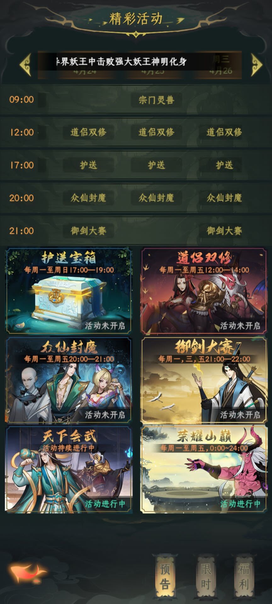 9.道侣双修、打符文、御剑大赛、荣耀山巅等活动,都安排在周一到周五。刚好周六日多数玩家比较空闲的时候不怎么安排活动了。