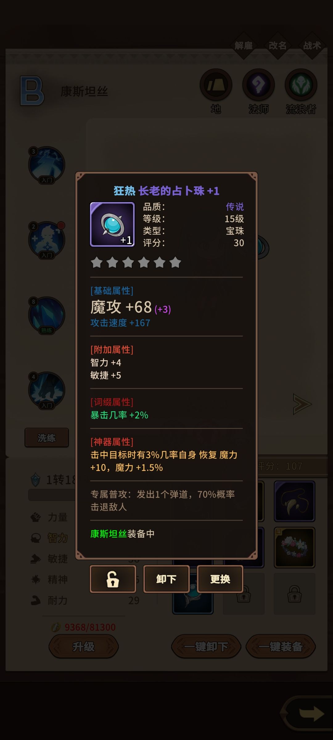 游玩体验还行,虽然卡顿,希望多送点多体验一下游戏内容。游戏主要是刷副本掉装备(白绿紫橙红),装备可以强化升级,还有套装属性。差评就是橙装(魔攻+12)的属性甚至不如紫装(魔攻+68),有些装备还附带基础属性,那更是碾压,我搞不懂,难道装备没攻击下限的。人物需要招募(目前只见过BCD级)。可以预见到后期就是刷刷刷,凑套装效果,不过我喜欢玩暗黑之类的游戏。