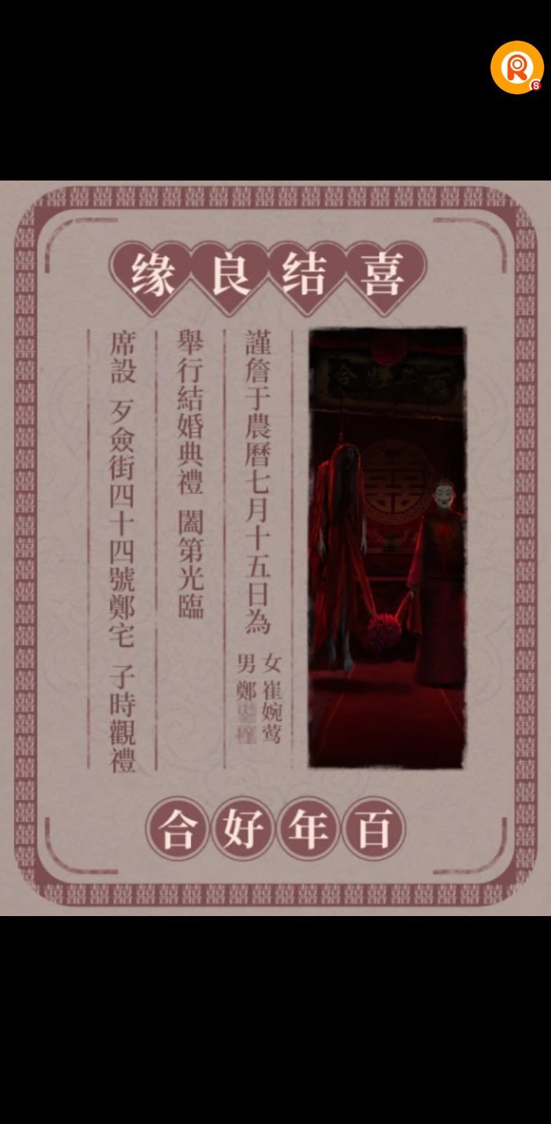 我们又不得不说纸嫁衣的核心仪式——阴婚祭祀。阴婚,拥有与“阳间喜庆的中式传统婚礼”几乎一样的步骤。也正因为它混杂了两种互斥特质的仪式,以喜为主题的婚,和以丧为主题的葬,这些看似正常、实则异常的诡异仪式,才会不断激发人们的毛骨悚然。
