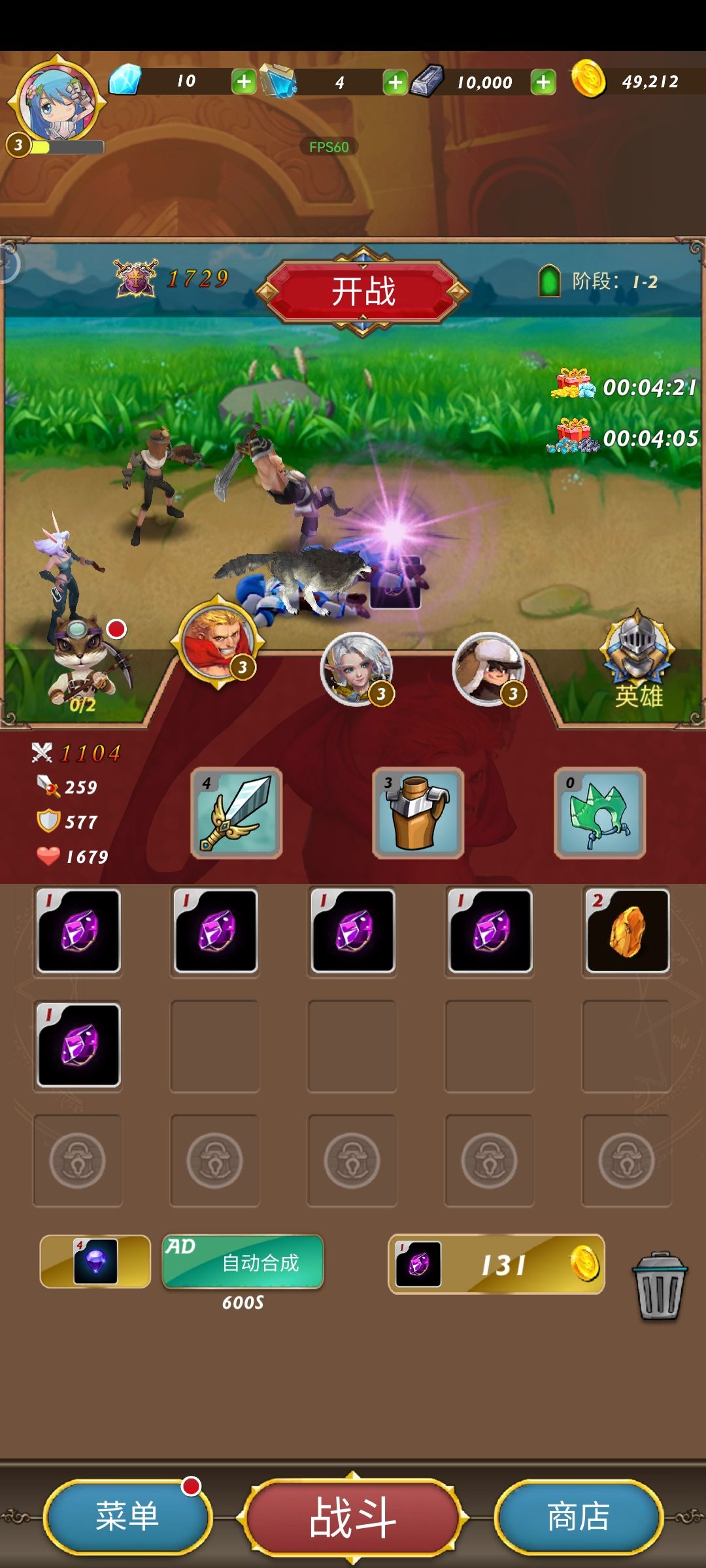 💡游戏创意:三消游戏带点rpg养成元素,算是一个创新点吧。🪄耐玩度:合成金币,升级装备。金币等级越高,给装备加的属性越多。注意低级金币不可以升高级装备。游戏支持英文和中文,但是选中文还是有些地方没有完全用中文。🎮可玩性:游戏有三个角色需要养成,装备,技能等等,想要体验好点可能需要看点广告。随着等级提高逐渐解锁雕像、锻造、魔法水晶等功能。前期可能会很无聊。🌃画面音乐:无声游戏,画面简单,广告标识也清晰。详细看截图吧。溜了溜了。😃