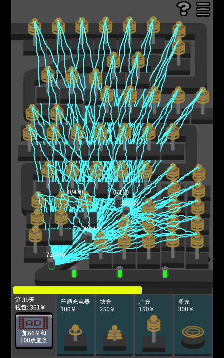 玩起来还可以,但我觉得后期广充才是真神,作者可以再开发一些减速道具,后面速度太快了,到了39天差不多玩不下去了,可以增加个减速带或者增加个充电器可升级,充电器等级越高充电越厉害,这个等级是基础等级升级,不包括放置充电器后的升级,可以新增一些地图,还可以增加充电器固定点位,就像保卫萝卜的那样,这个自由放置对强迫症打击太大了🥺,我这放置的还可以,就是有些细节放歪了难受半天,或者新增充电器或者传送带设计的小一点,空隙大一点,再在空隙处放一些家电充电获得道具之类的,也可以新增新的充电器品种,可抽卡或其他方式获取,可叠加相同的充电器,再搞个新的主界面,增加一些新玩法什么也可以,可以增加一些新的玩法设定,也可以改成横版,也可以修改一些充电器的设定,比如范围修改等,电池🔋速度可以减慢一些,当然这只是一些新想法和一些建议,作者加油!😍