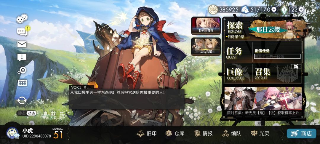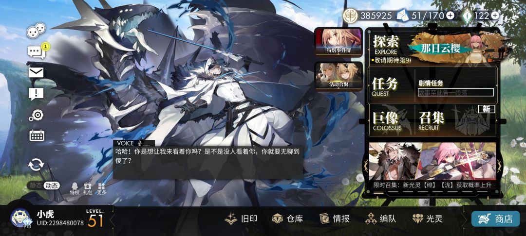 8.4太好玩辣,能不能多更点主线。本来抽妹妹和醒山都抽干了,黑匣和主线通关活动一下又给了好多,又攒了50抽了,一破烟妹我来辣,福利是真的可以。