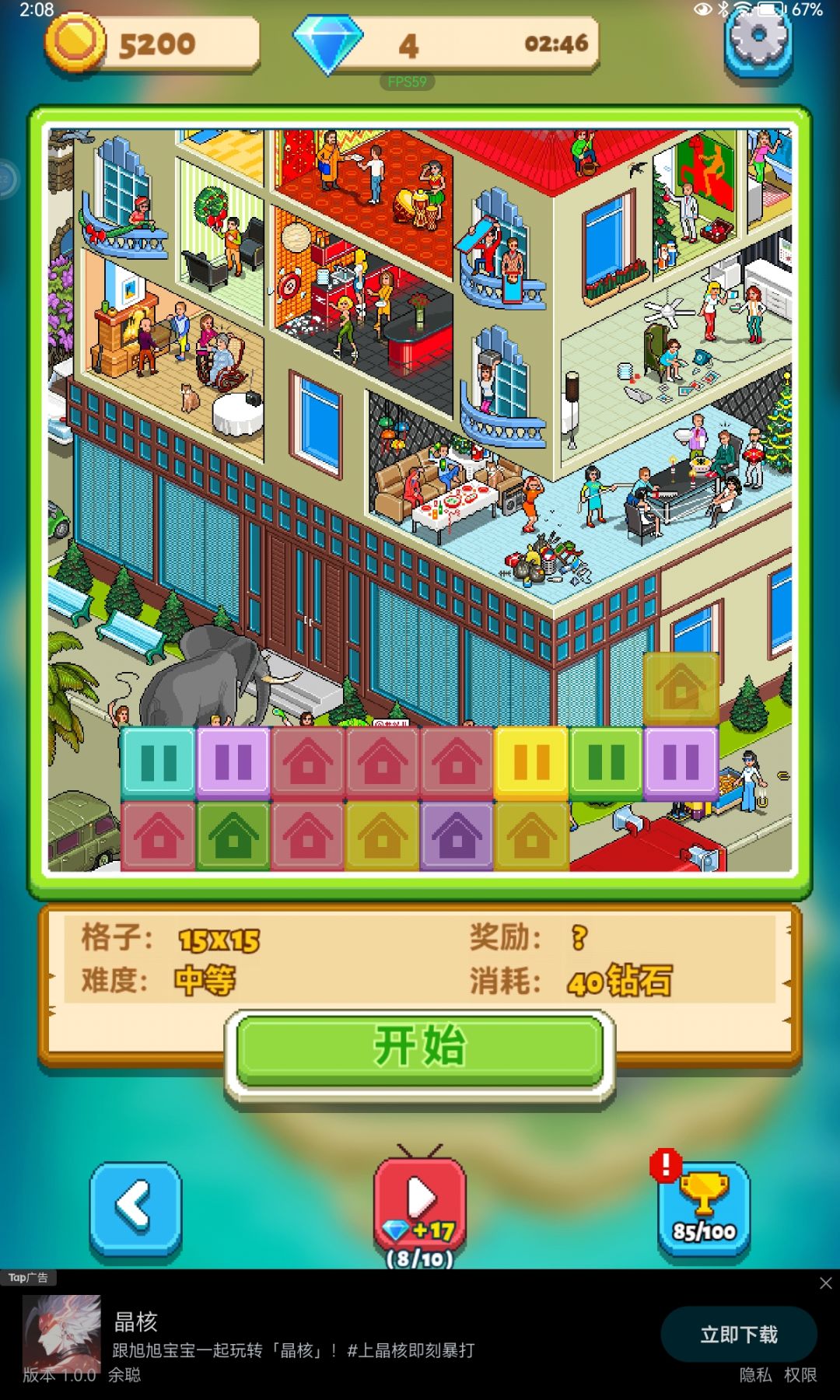 游戏挺上头的,而且钻石感觉恢复的很快,没一会就满了,游玩的时候虽然有弹广告预警但是从来没有玩的中途弹出来过,除非我主动点开广告去获取奖励,除开登陆的时候的广告其他时候并没有强制我看广告,我不知道是不是设备的原因但是我一个小米手机一个华为平板两个设备都没有出现强制广告的问题,所以游戏体验还是很好的,没事干的时候听听歌然后玩这个感觉挺放松的,有的关会比较难花点金币就有提示也会很好过关,基本上不会卡关什么的,我这个设备大概两天就把第二个图玩了四五十个关了,单机游戏不能登陆换了设备就得重来还是挺伤的()