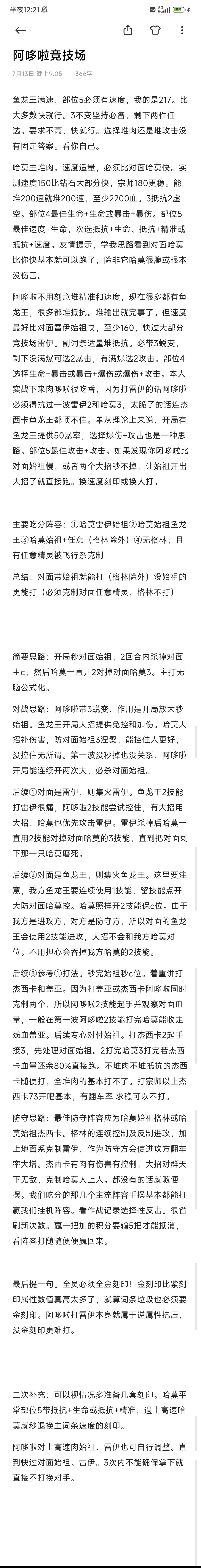 很多人说pvp没有始祖灵兽、没有鱼龙王就打不了?错误的。始祖灵兽对于巅峰赛确实基本必备,但是打竞技场根本不需要。我的竞技场就是靠开局阿哆啦双大秒始祖上的前30(说到这我就忍不住想吐槽一下,你游这个段位设置怎么这么奇怪?前五十王者4,结果王者3居然要全服前10?)个人原创玩法,专吃始祖的分。思路没有学习任何人,在我验证可行后就将细节整理好上传战队群(可惜没人学)当时我还是队内唯一的竞技场宗师,开服第一天进的战队,功勋也最高。但社长迟迟不给本人副社,一直都轮换给新人,当时还在战队群里差点吵起架(当然,在我打上王者之后立马就给我转了副团)不知道一个月后的阿哆啦现在在竞技场进攻方实力怎样,但我确实是靠这套打法吃始祖灵兽的分上的王者。基本打始祖胜率91开吧,碰上雷伊也完全不怂。