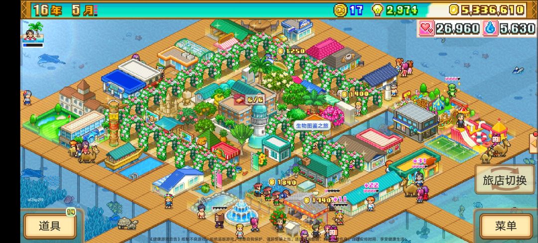 这个游戏主要从休闲,美食,观光,生物,旅店人气,游客人数,印章几个方面进行评定。