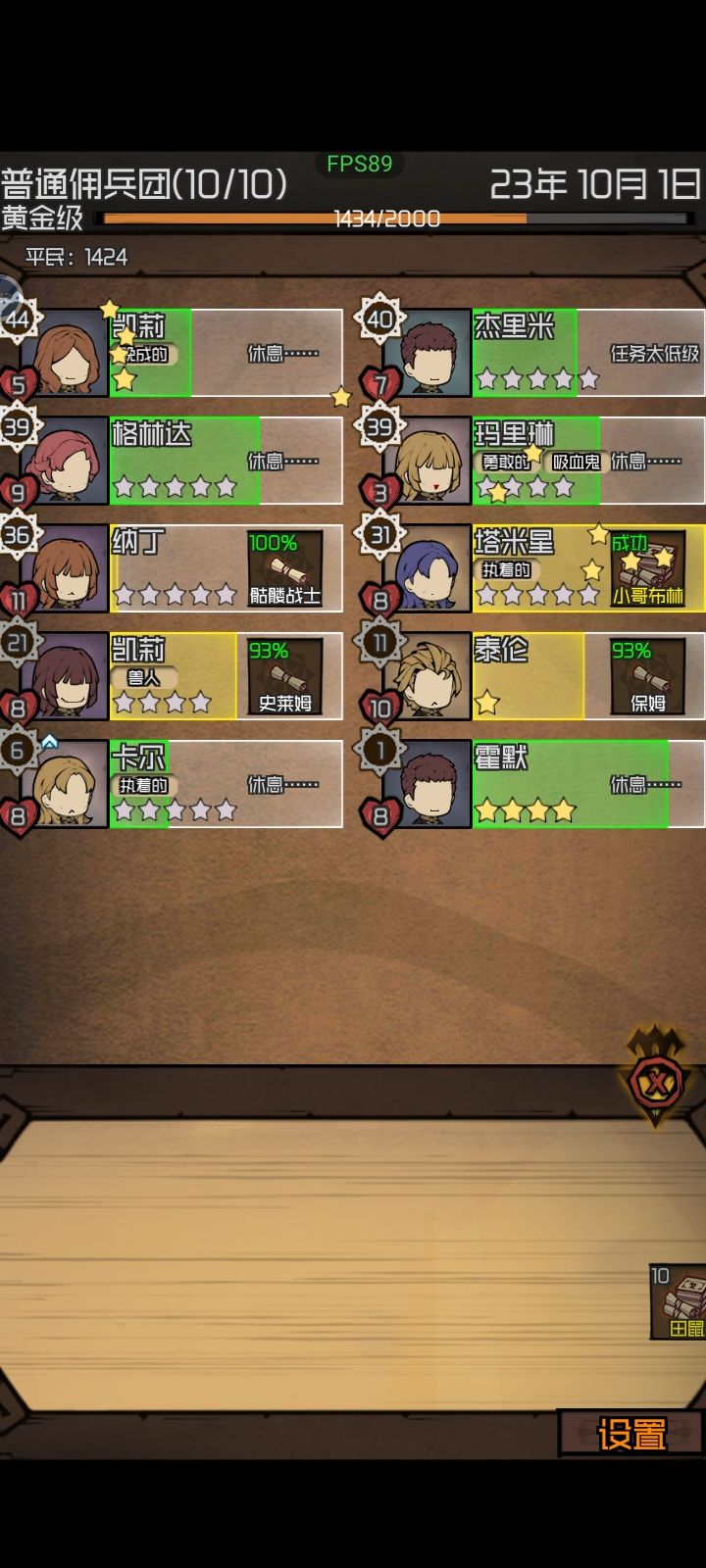 玩了一个小时左右吧,目前是卡在第一个小瓶颈黄金级佣兵团,从10年左右卡到现在33年,过了20年平民才加几百,每年固定掉10%,一年也就加200人不到,还有的熬。