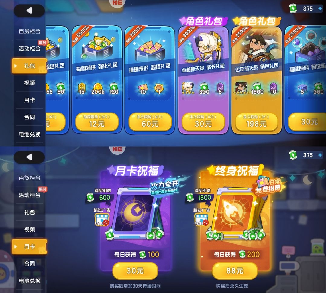 角色没必要买!因为你买不完的🤡,弹窗角色限时购买+商店角色购买,他家游戏收集党纯纯坐牢,要一直氪,目测后面还有各种限定角色卖68、98、128、198等等…之前玩妙奇星球就是,每个版本活动都有角色礼包(目前玩到第一章角色礼包如图)角色立绘Q人啥的感觉品质不值这个价,礼包角色有的奖池没有,只能买礼包!活动送你角色信物,本体要你累氪158送,氪金1000的限定建筑,永久卡买的时候显示免费一抽角色和建筑,结果建筑要两天才免费抽一次,购买界面却没有说明,只是笼统带过!
