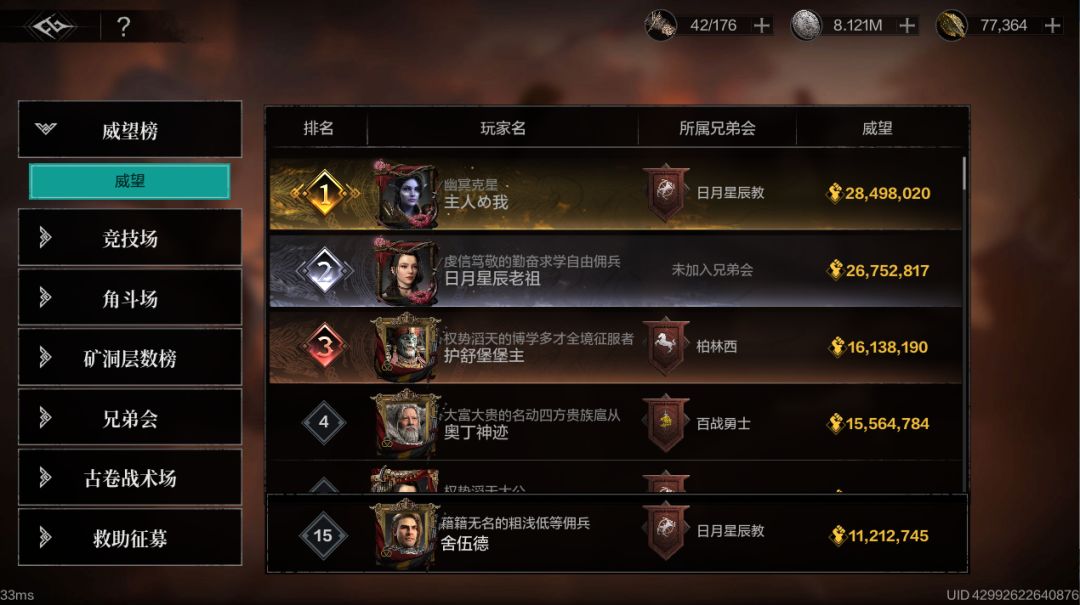 先自曝家门,在下是加尔多服的舍伍德佣兵团团长,23年2月入坑环形,目前全服威望榜15名,竞技场常年在15以内,1121万威望值,藏品152万。目前7个满眷。