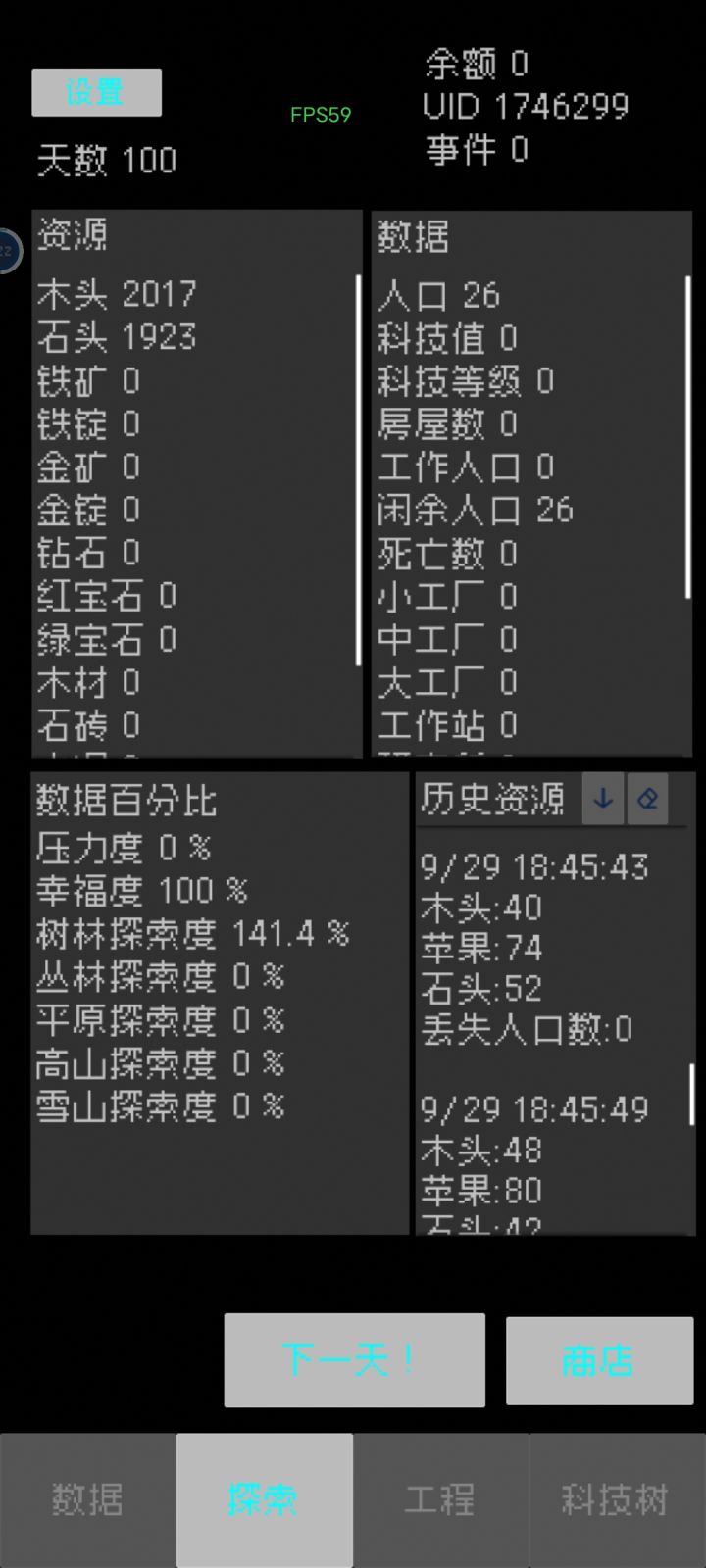 🎮可玩性:目前来说,有意义的数据就这几个人口,加探索的次数的,一个人口每天扣一个苹果。好了,没有了,其他内容均不会对目前完成度的游戏有任何影响,探索度也是,其他地图也是,包括上次更新的设置键也是,甚至看不到能设置什么。我不直接断言未来的游戏是否会有成长的空间,但是以目前的完成度来说,这不能算作一个正常的游戏。因为完全没有游戏性,完全没有内容可言。