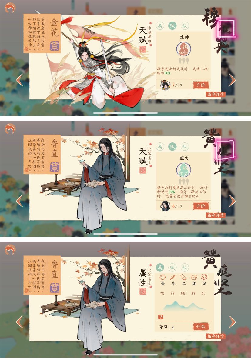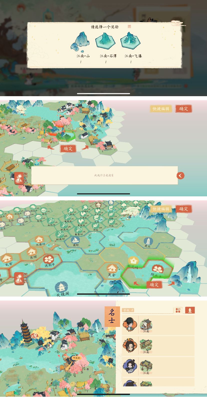 6.查看名士当前在哪一建筑工作的界面只有名士所在建筑的图画和所在地区(江南),无法记住每个图画所对应建筑的玩家需要点击图画进入地块查看具体是哪个建筑;