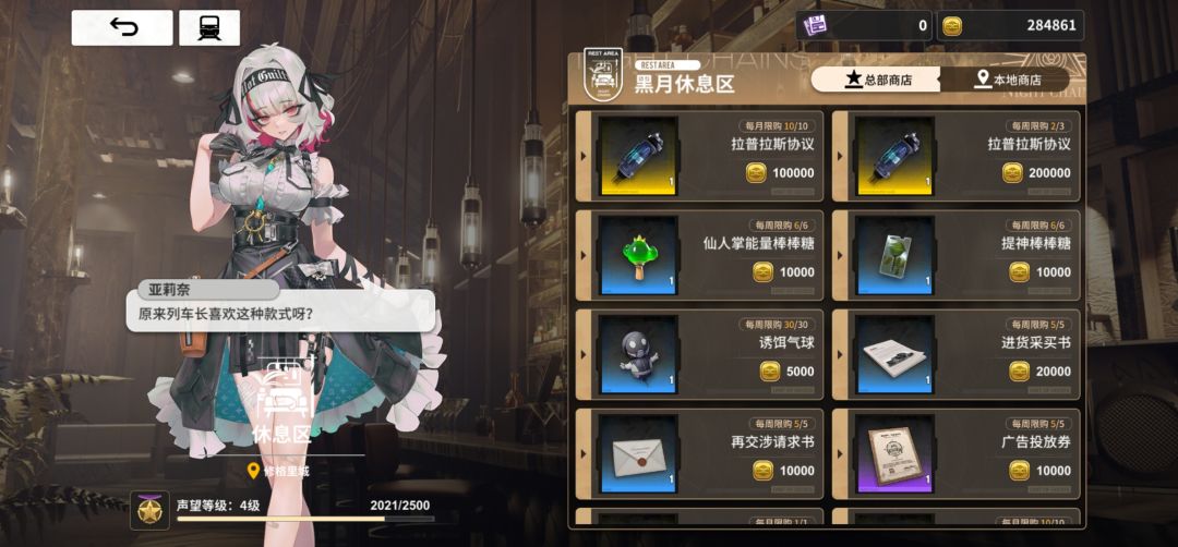 游戏内用于角色、武器、列车的成长培养,以及进货都需要用到金币,你甚至可以在休息区的黑月商店用金币购买抽奖卷,每月十张每周三张,一个月算四周的话也就是22张。(这个好评)不过池子有点恶心,现在是50抽以后开始增加概率,9次sr之后才保底(会歪50%),建议改成30-6,你的50-9未免有点太自信了。