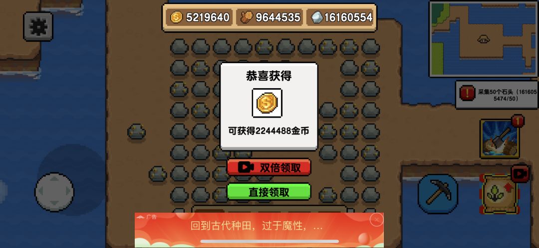 应该算是通关了吧,解锁所有地图,发现了bug哈哈哈哈,宝箱按照比例给,基本上是三分之一,前期给的少,肝了半小时左右,一个宝箱给两百万金币了就,只能显示8位数,后期已经十几亿木头石头了,每次只能卖50个哈哈哈哈哈哈哈
