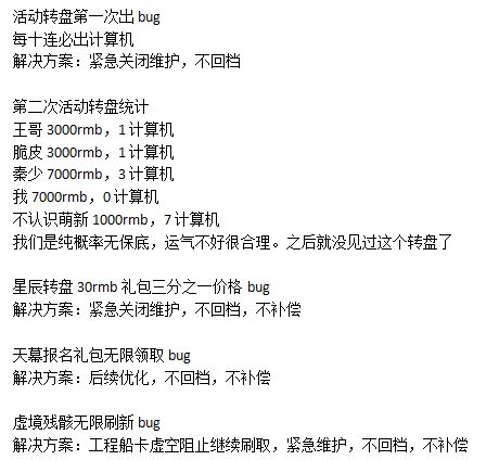 1.天幕bug,仅仅78区出现,可以无限领取游戏礼包,刷资源,持续一天。我都不敢想他们刷了多少东西。策划的解决方案是不回复,装死,等玩家忘记。