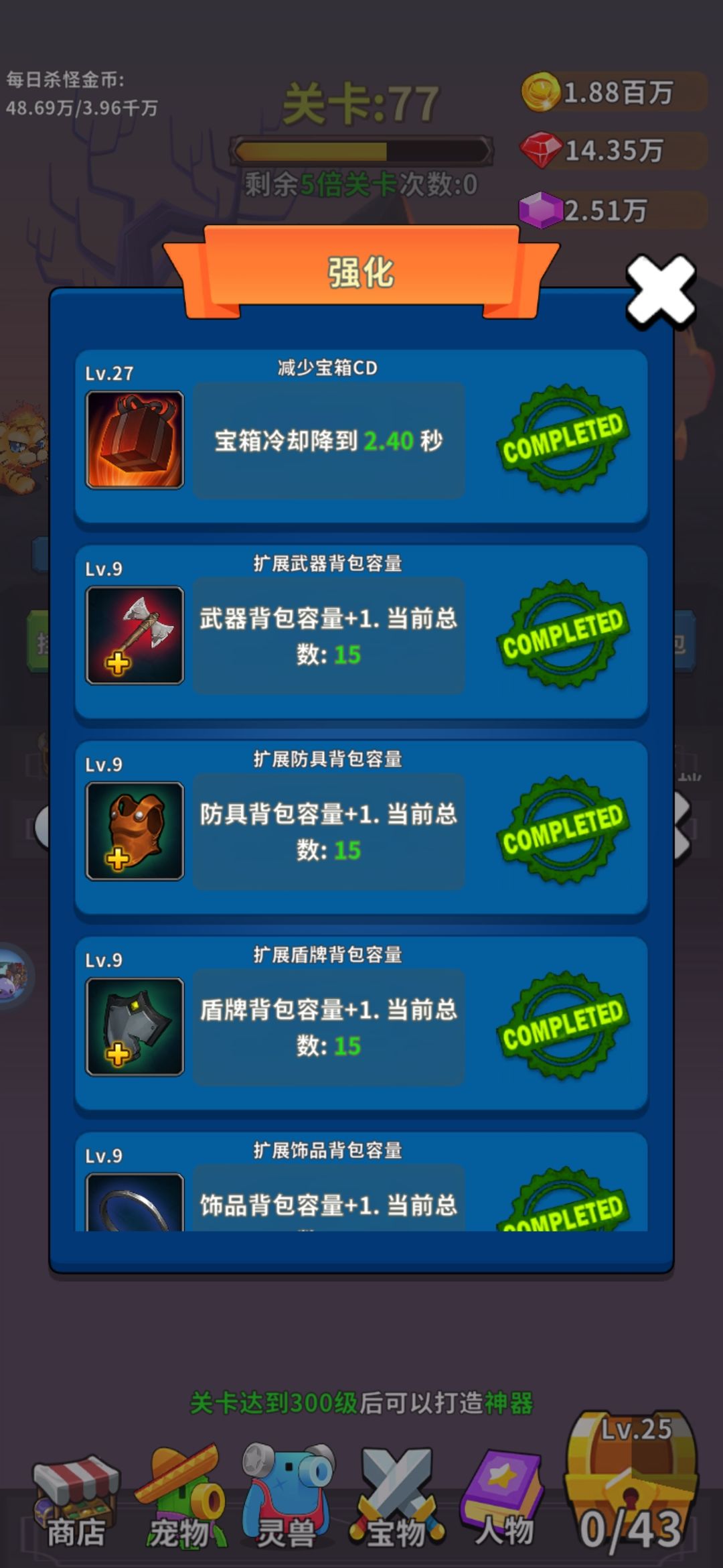 🕹️耐玩度:耐玩抗造。💰肝氪度:纯肝,广告也不是很多,不过有成就系统,需要看满888次,强迫症玩家的话可以看。(可看可不看)🎮可玩性:个人觉得可玩性很高,装备都是系统自动打造,有送的必出传说图纸(30级装备自动打造)成就里面有自动合成,自动打造。只需把图二点满即可(人物-强化)