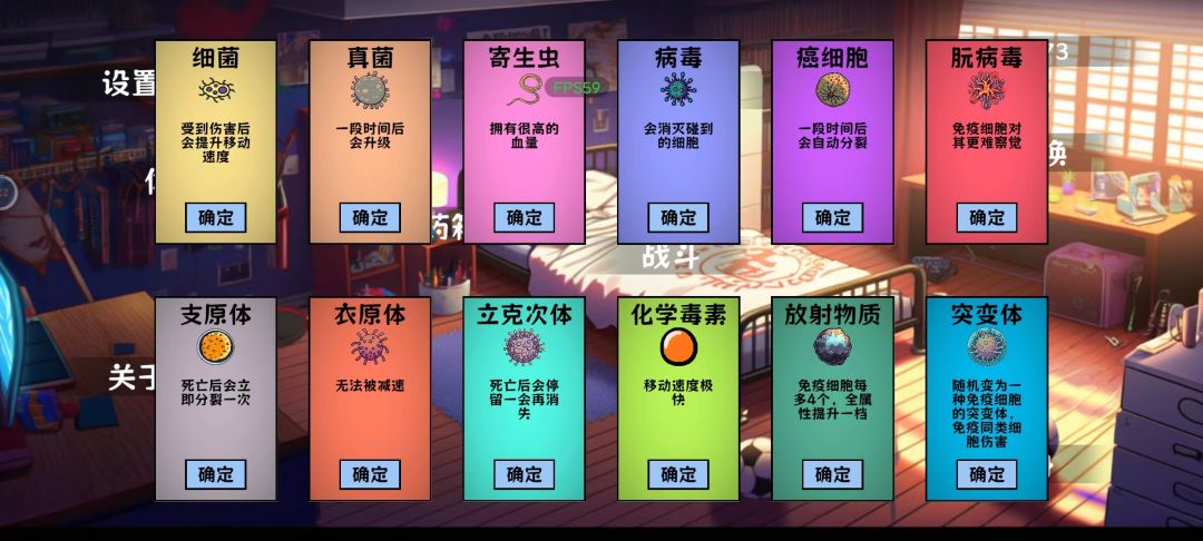 (2)关卡建议按照“难度系数”排序,不然容易卡关,目测现在是按开发节奏排序的,类似第2关真菌,明显比衣原体难得多,前期没啥资源容易直接卡死,只能地看广告点天赋...对咯,通关困难/普通关卡后,可解锁低一级“简单”关卡