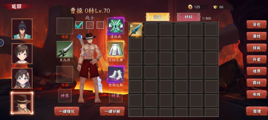 然后点击右边人物,再点击右边属性,找到一键升级,直接点击一键升级,然后重点来了!经验书虽然消耗完了,但点击右边背包,再点击材料,经验书图标还在,但却没有价值了,卖了也等于0,但是!把经验书前面的物品,卖掉一个,空出一格位置后,再点击右下角整理,这时候经验书会自动往前,然后就直接变成可以使用的状态,关闭背包也还存在。