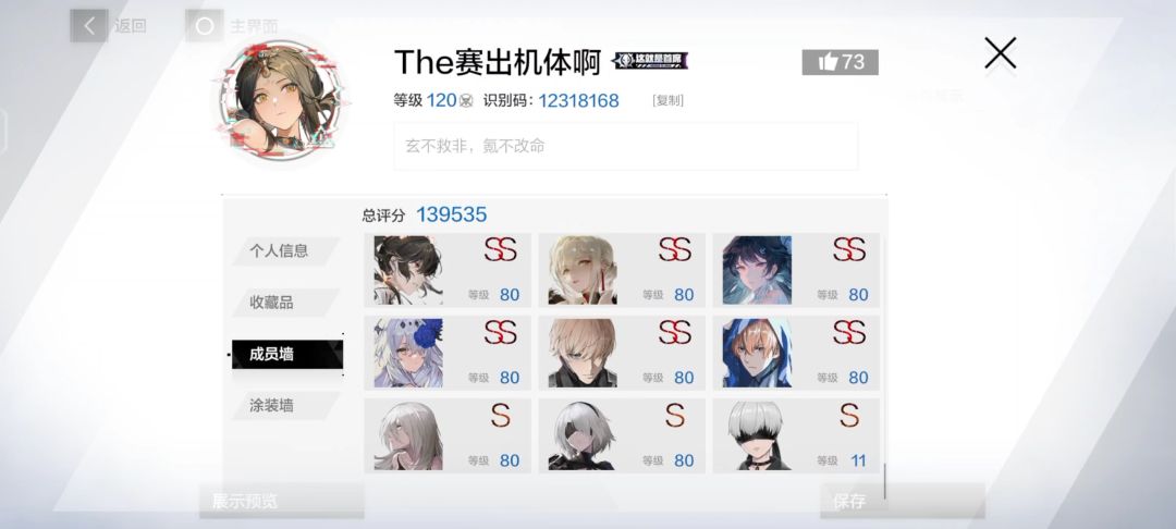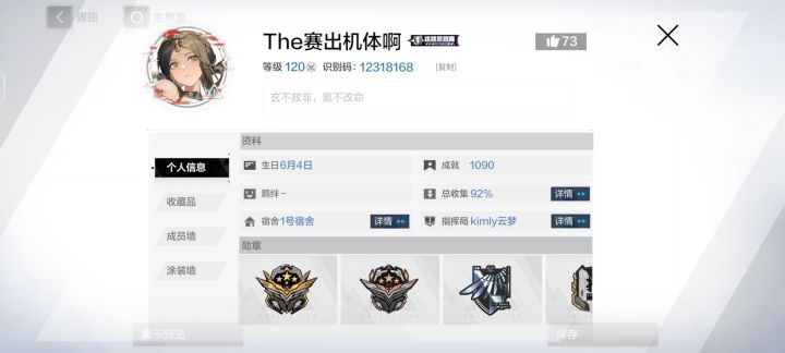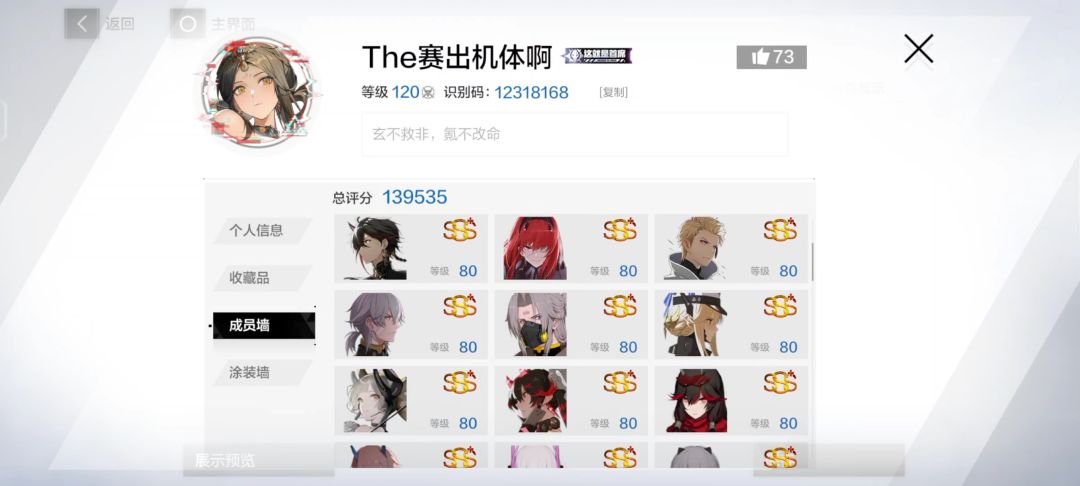 2024/8/14勋阶100级了,又到了战双玩家的神秘仪式了2024/3/17什么都好,就是不好玩。唯一乐趣就是抽卡,战区凹分了。小游戏都一样。我还是喜欢熊熊破坏王和黑岩版本出来的棋。为什么特效皮只变结算动画(比如雷队薇拉首发,出场动画没变,有时也看不到结算动画)。有两个黑卡好一点的黑卡皮要变出场动画,却不能首发。最后就是我太爱曲大人了,2s唯一真神。有了她过《高难本》太快了。但是一直看登台阶也太无聊了。