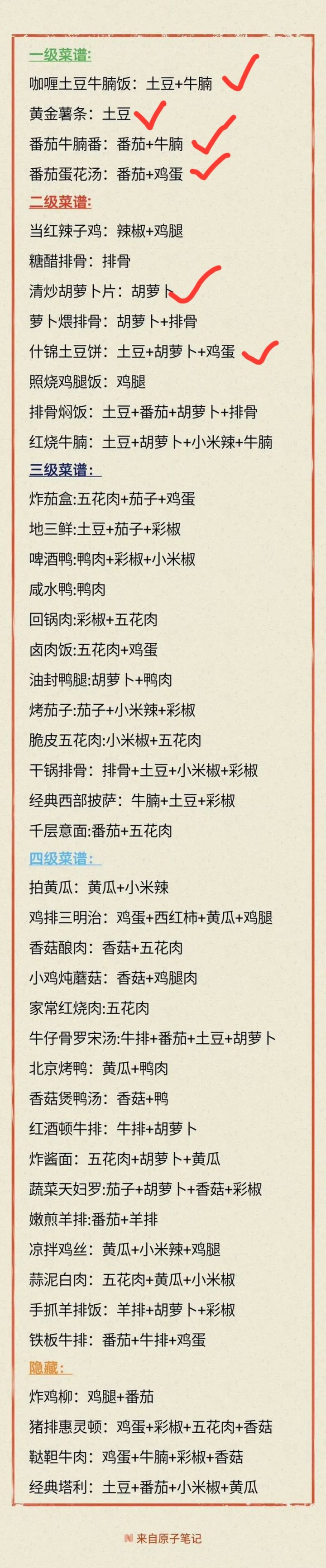 没截图附一张tap存的菜谱攻略吧。不记得谁的了。谢谢原作者。