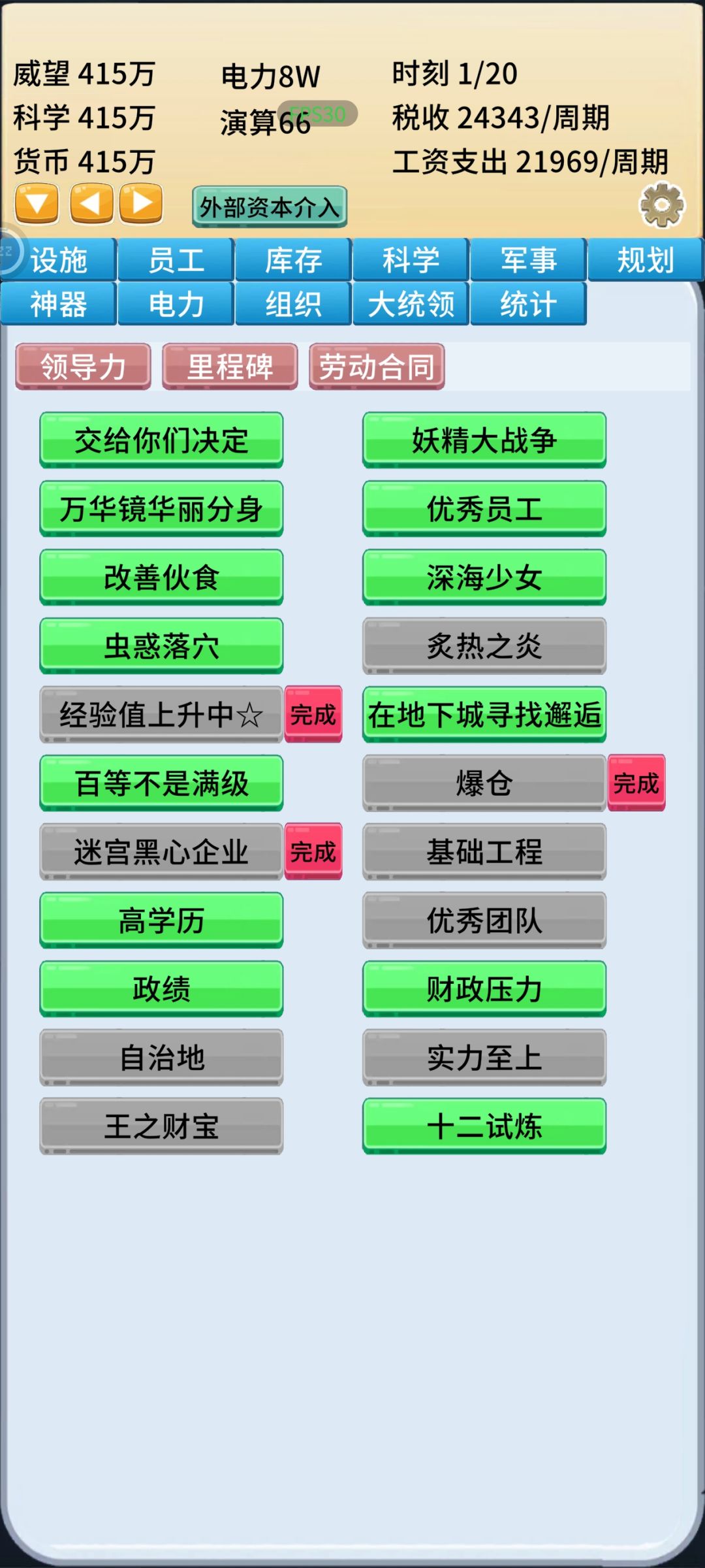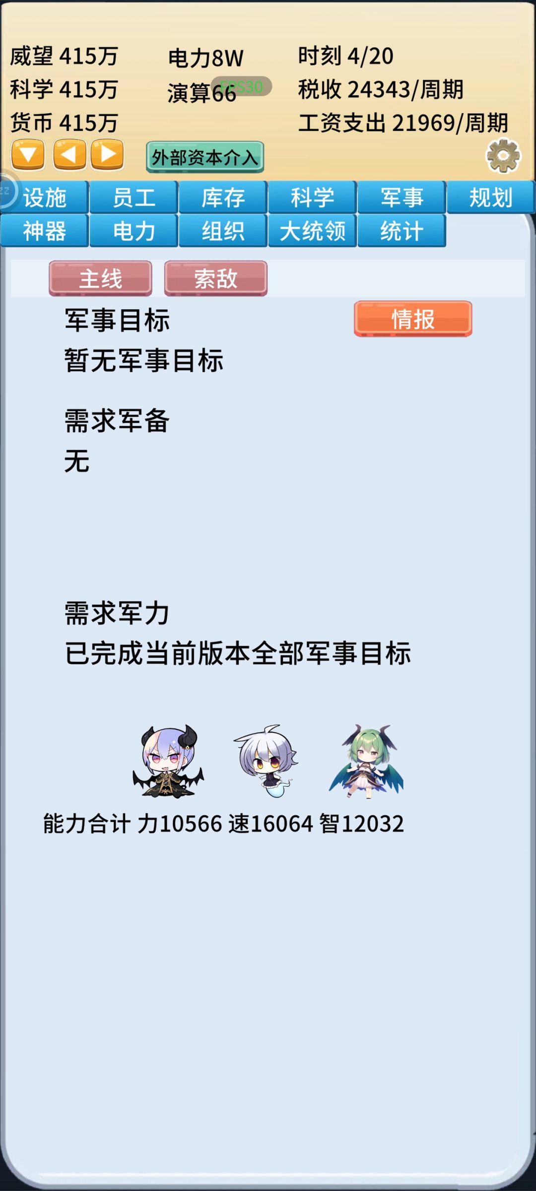 目前这台设备不兼容魔王归来,所以我去魔王城上班了……咱都玩放置类游戏了,除非是炸存档,或者一开始就不接受画风or设定or系统,不然选到对胃口的,都差不到哪儿去,是肝是佛全凭自愿。(点名《原子暴走》,作者肯定也是用心设计了的,但俺一文科生完全代入不进去,从哪儿亮点哪儿到放弃就是一下午的事儿)建议的话:领导力模块加一个“修养力”,提高离线收益时长上限或者离线收益倍率,8小时还是有点不够看。员工模块增加按种族以及按聚落划分的筛选模式。
