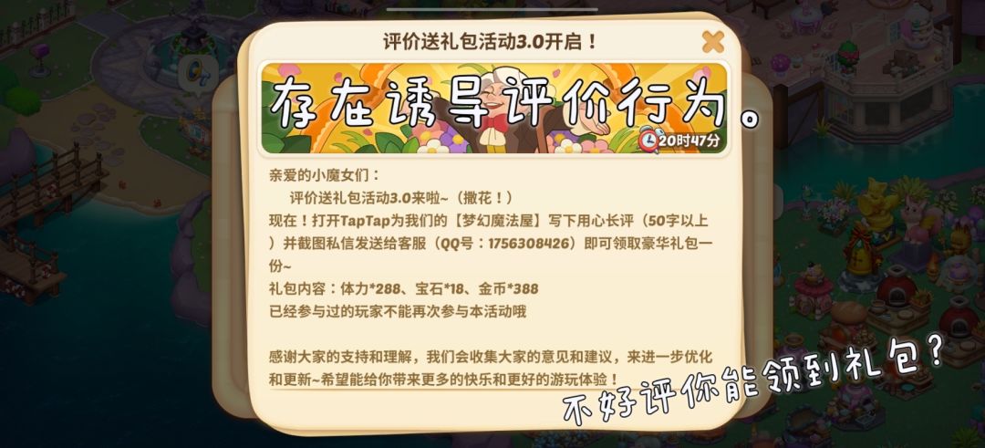 □存在用游戏礼包诱导玩家刷好评的行为,已开展到第三期,请自行甄别(差评你还想要礼包?文末有活动截图)。