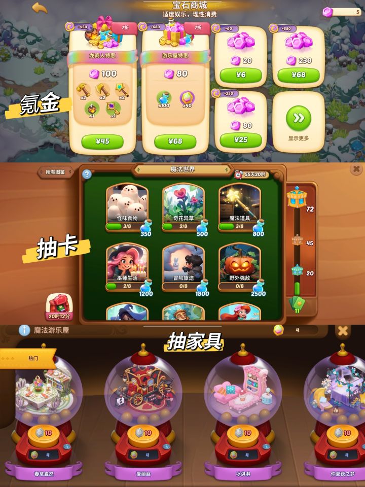 围绕体力(能量)搭建的体系,有体力采集材料才能开展其他事项,生产制造方式为[低合高],对低级材料的需求[无止境]。部分收集养成元素,集家具活动建筑和抽卡。