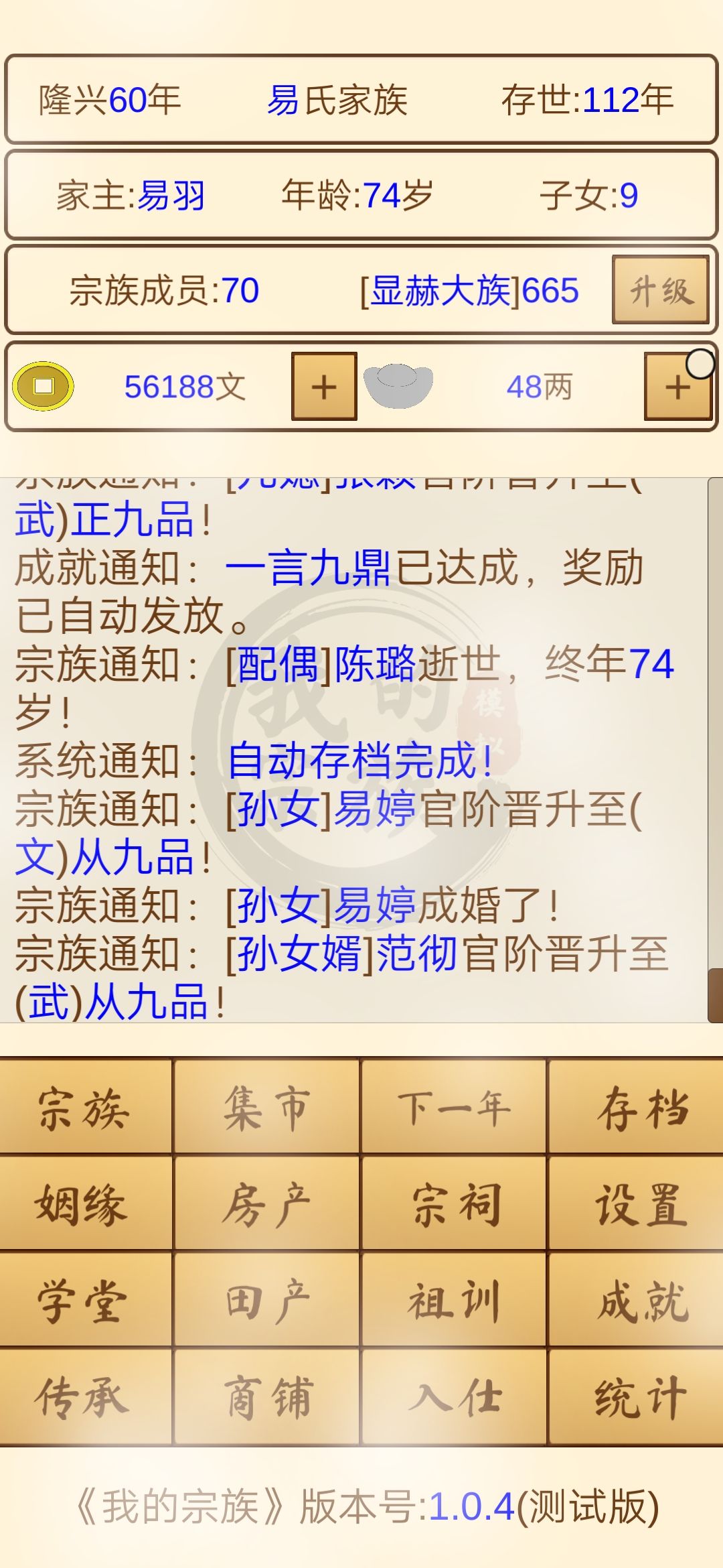 超级上头,玩了两个小时基本拉到顶了,房产田产商铺allin,家族升到最顶,儿媳孙媳女婿孙女婿全都500+属性往上,全都做官,就是死的太快了,平均每代也就活二三十年。不太愿意作弊复活。感觉玩得最好的是第三代的时候,家族七十多人,有种看着家族走向兴旺发达的满足哈哈,后面基本无脑点点点,适合无聊的时候玩。屏幕里有飘动的白色雾气,不知道是不是故意做的特效,建议出一个关闭功能,看久了累眼睛