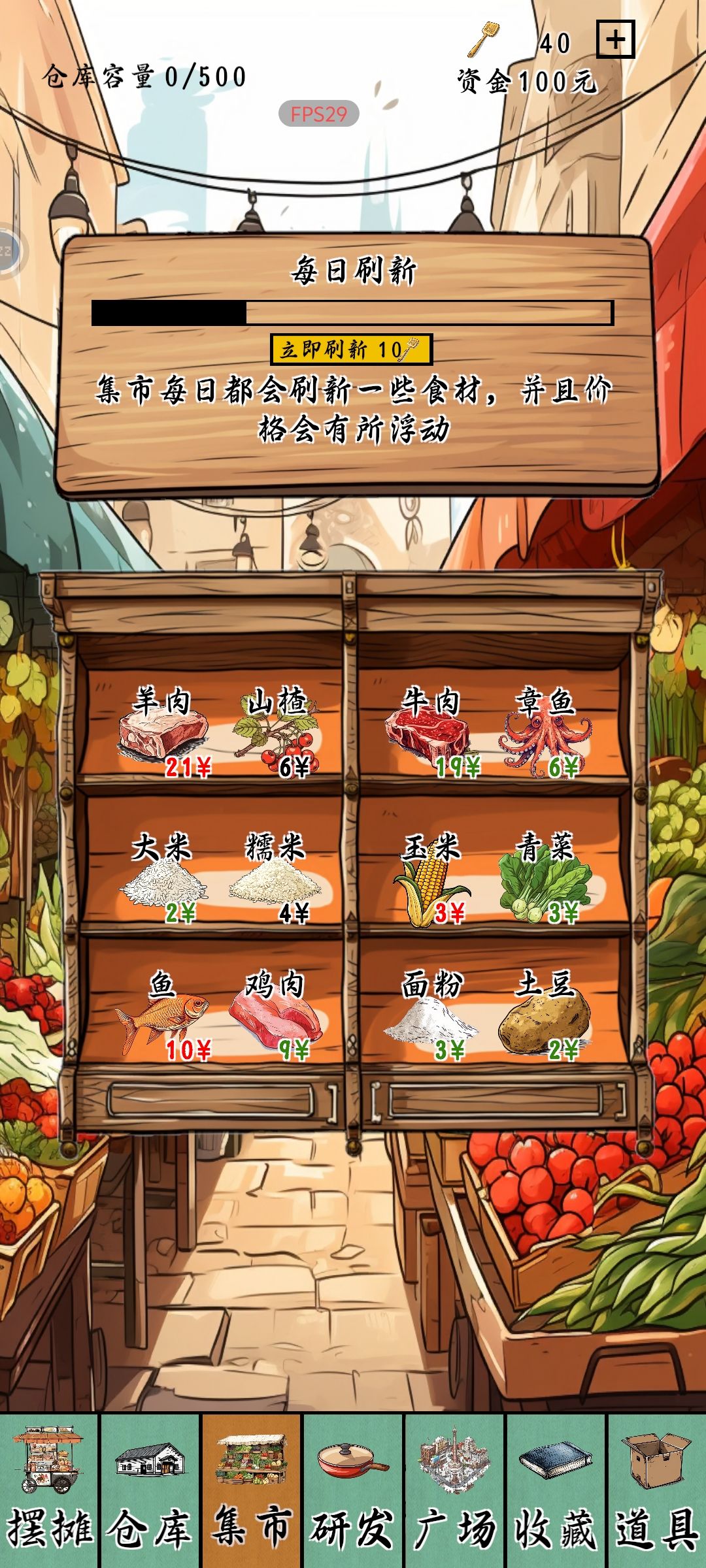 菜市中会固定刷新出存在价格上下波动的随机品类食材,选择购买与制作售等经营思路,都准循着“获利=售价-成本”简单原则,如何迅速创收,其最大策略点在于:抽取、挑选、搭配菜谱,适应各式物价与市场条件;