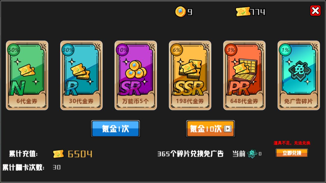 氪金点,用来购买游戏内礼包:每日、新手、限时特惠、通行证等,模拟氪佬畅通无阻的付费体验,而免广卡碎片需集齐365而抽取概率为1%,虽说集齐后约等于破解该游戏,但操作过程较为迷惑,犹如为了忘却喝酒的羞愧而喝酒的酒鬼~