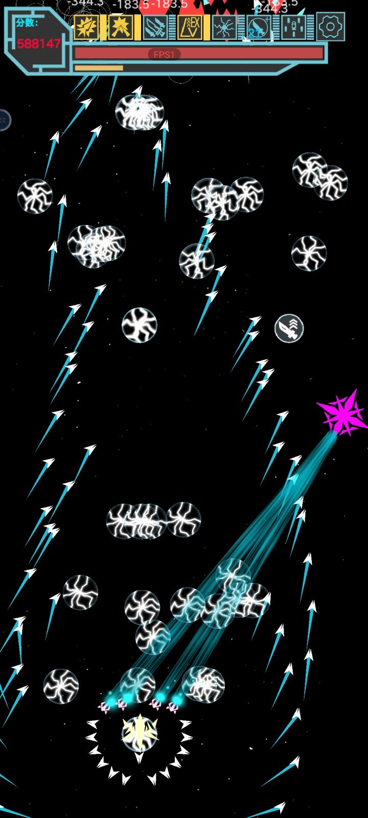 非常优秀的roguelike打飞机游戏,画风非常简单,但是很好玩。我玩到50w分手机带不动了,扣一分就扣在追踪弹性能不好。肯定是追踪弹性能问题,不用想。建议作者研究一下快速正弦函数算法(打个表),优化一下性能。