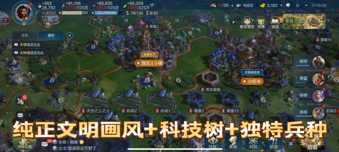 而世界启元带来了一些不一样的感触,虽然依旧是一座小城开局,地块全靠打,但引入了时代进步的特点,让每一个文明时代的进阶都有小小的成就感;虽然依旧是卡牌编队,但卡池范围扩充到全世界历史的他让人有一种天下英雄尽入我彀中的畅快感;虽然依旧是科技加成,但加载了文明科技树的他将兵种特效、城池效果融入的更深、更细;虽然依旧是联盟打城、乱战翻地,但是加上文明奇观的建设,联盟成员之间的联系更加紧密;虽然依旧是英雄带队、小兵攻防,但是延伸到海陆空的兵种设置让游戏更加有策略性,这些文明IP所赋予游戏的不仅仅是一张作为噱头的皮,而是真真切切的把文明的核心融入进来,形成了自己独有的特色,在三国题材泛滥的当下,不得不说别有一番新意。