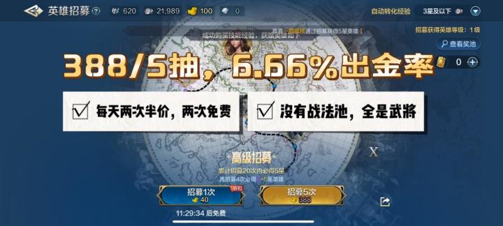 那世界启元是怎么做的呢?登陆就送初始队,这初始地可不是那种只能用来当狗粮的垃圾,是实打实可以开荒开地有着不错战力的队伍;每天金币卡池两次免费抽取,两次半价抽取(半价40金/抽,相当于4元RMB);卡池降价,388/5抽,平均价相当于7.7RMB抽一次;增加出金率,20抽保底,6.66%出金率;战法不用吃本体升级,拆解就是完全体。