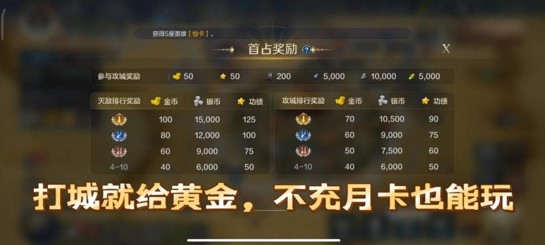 而且最为关键的是即使是白嫖和,在一赛季依旧能玩,依靠这游戏本身的福利以及参与联盟打城(只要参与就给50金,如果灭敌和攻城有排名,还有额外奖励)获取的金币资源,完全够一整个赛季的半价支出。