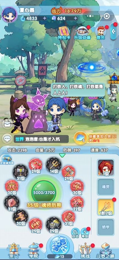 主流玩法为锤魂环,会有个锻造台,你锤一下会出现不同品质的魂环属性,锻造台越高出现高级的魂环概率也就越大,而且有自动锻造,设置条件后就可以开始了,会一直锤到你想要的装备为止,第一天玩起来会停不下来,因为魂力会比较多,后面就会资源不太够了,只能让你每天锤一会,别看游戏小,内容确很多,人物到后期还可以选择武魂,而且渡劫后会有新的形象,属于越高级越炫酷那种,玩起来挺有意思的。