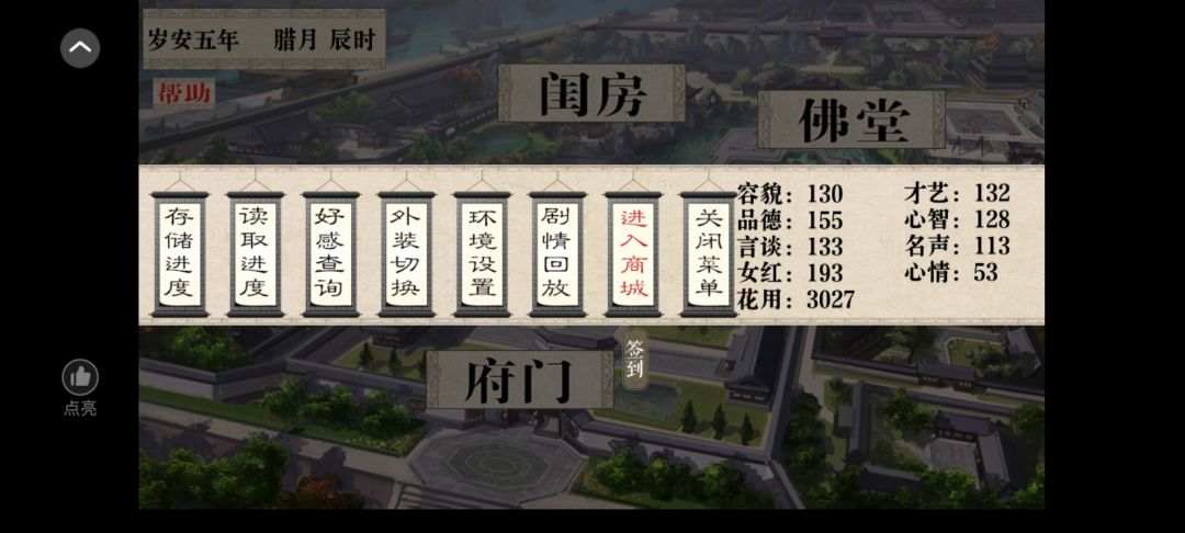 重下之后就正常游玩,虽然没有bug给我卡,但也略懂些经商之道,通过存档读档刷出某些物品降价,而后又再通过存档读档刷出物品价格上涨,钱就有了。重新游玩,我比较贪心,想要升满所有闺蜜的好感度,并想要把他们的事件都经历一遍,又想攻略男主白允晟。然后我分身乏术,闺蜜的好感度升满了,事件也经历了,但是男主只经历了三个啊,好感度也只有20几,并且我还没有达到佳人帖的要求,直接就被嫁为妾室了,哭。