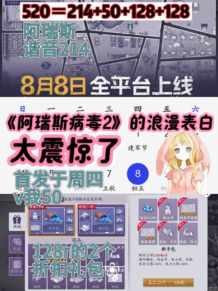 ❀「玖儿」世界上最浪漫的公式:520=214+50+128+128❀520是游戏最真心的祝福。214是阿瑞斯的谐音。50是首发于疯狂周四,致敬kfc。128是两个专门打折后的礼包价格。❀天啦!Σ( ° △ °|||)︴用自己的ip、发行时间、还有折扣价格,凑出一个极为浪漫的告白。它真的,我哭死(๑ १д१)