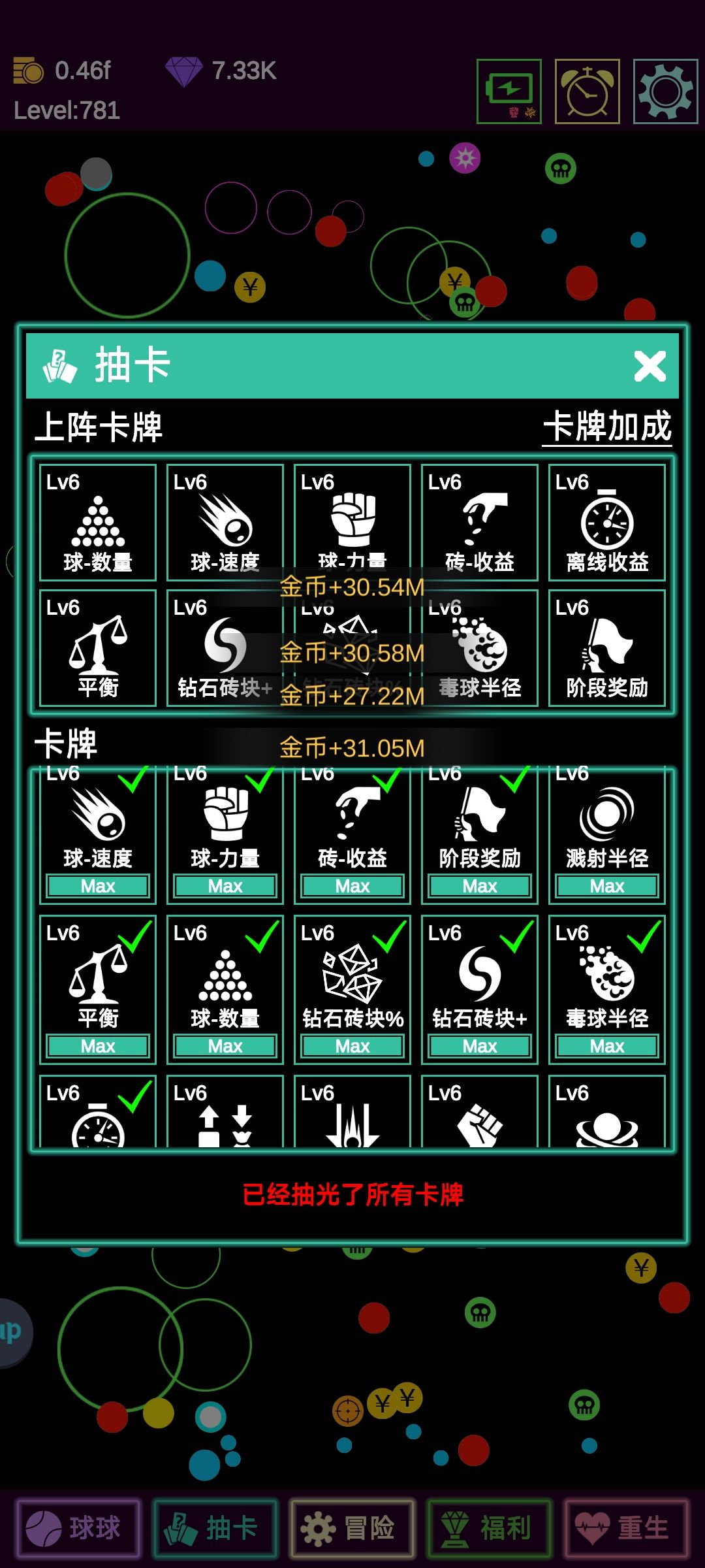 此时卡牌已经集齐,钻石就用来玩金币流。为什么此时才用金币流呢?因为金币流一开始给的金币很少,需要不断用钻石去堆。但好在重生后,金币流的金币还可以留存,也就是说再次用钻石购买金币将会以重生前的最高金币为起点。此时就不用在考虑钱钱球了,因为从钻石来的金币远比钱钱多得多。钱钱完成她的使命可以退居幕后了。这个阶段可以主升攻击力高的,如大剑、坦克,加上毒毒的倍率,冒险基本上可以秒杀,一秒之内通关,一百关也就一百秒不到。通关可以得到钻石,再次等待机会重生。