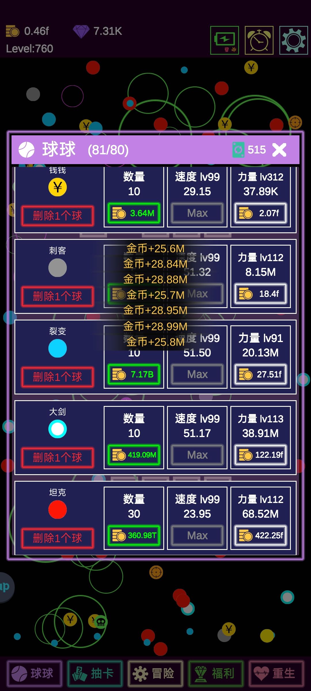 前期主要靠“钱钱”打钱,钻石全部用来抽卡,这段日子是比较难熬的,因为没有钱升级球球,冒险可能会卡关。打不过没关系,大不了重开嘛。